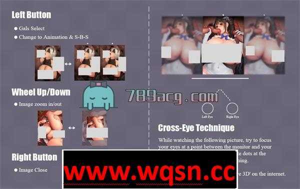 双眼正视左右图片,然后把眼珠对起来,形成各种重像再拉远,就会逐渐形成一个完全的裸眼3D立体CG,简单说就是用斗鸡眼,非常有意思!